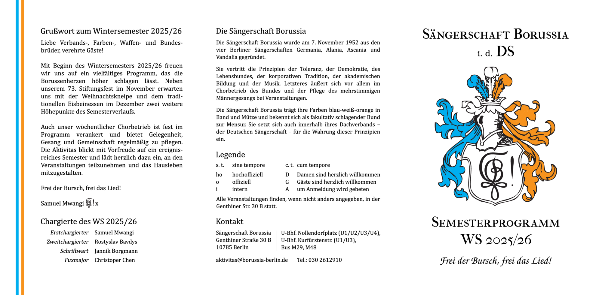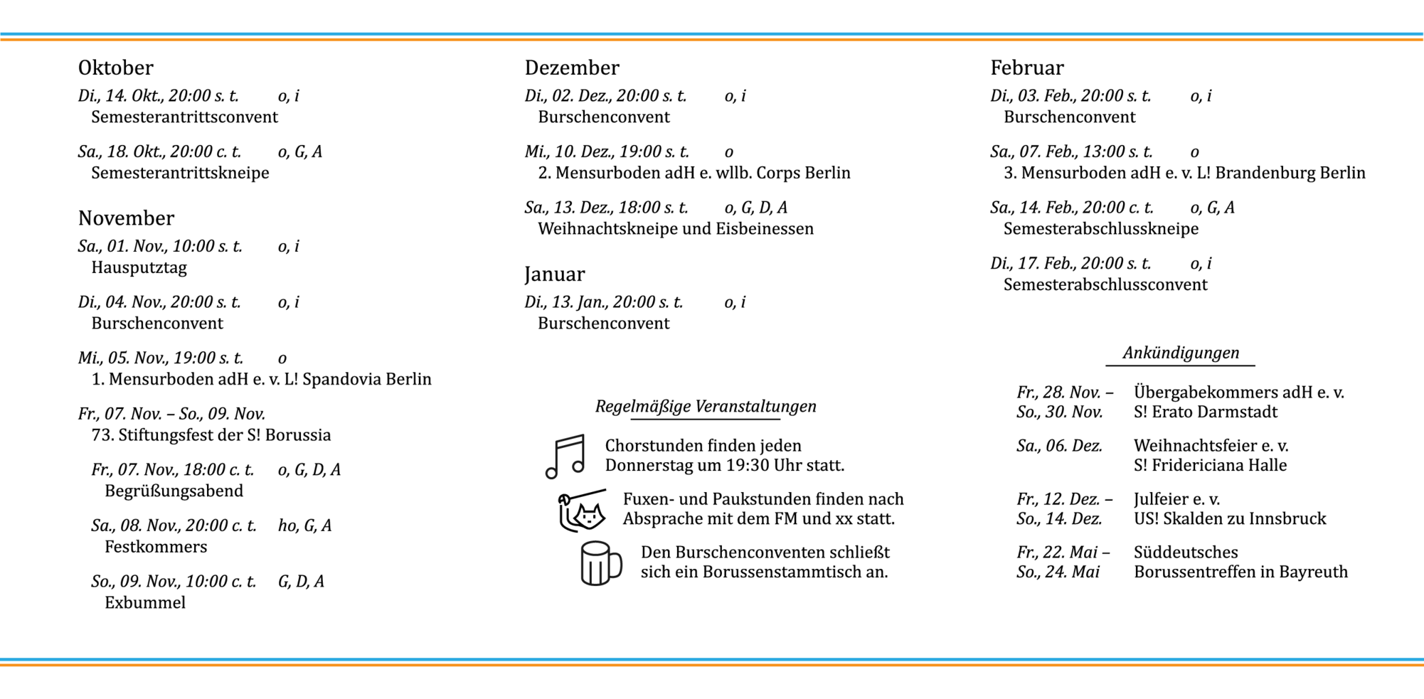 Bei unseren Veranstaltungen steht die Geselligkeit, der Spaß und der Gesang im Vordergrund. Darüber hinaus bilden wir uns gerne weiter – etwa bei akademischen Vorträgen und Diskussionen oder bei Konzertbesuchen.